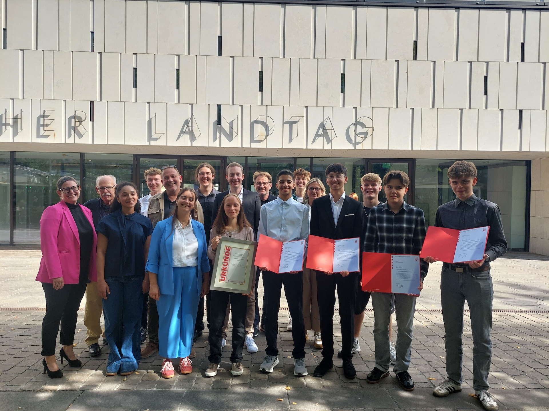 Am 26. August 2025 konnten die LLG-Landespreisträgerinnen und Landespreisträger am diesjährigen Geschichtswettbewerb des Bundespräsidenten, Elisabeth Aberschanski, Mahdi Hadi, Michael Gleiser, Elias Aycan, Joshua Dyck, Nele Zeh, Nicolas Weigand, Jan Löschen und Luis Wagner, ihre Urkunden von der Landtagspräsidentin Astrid Wallmann sowie von Kultusminister Armin Schwarz in Empfang nehmen. Zu Beginn der Veranstaltung wurde auch die Leistung der Förderpreisträgerin Karlotta Zimmer sowie des Förderpreisträgers Ian Caulton gewürdigt.
