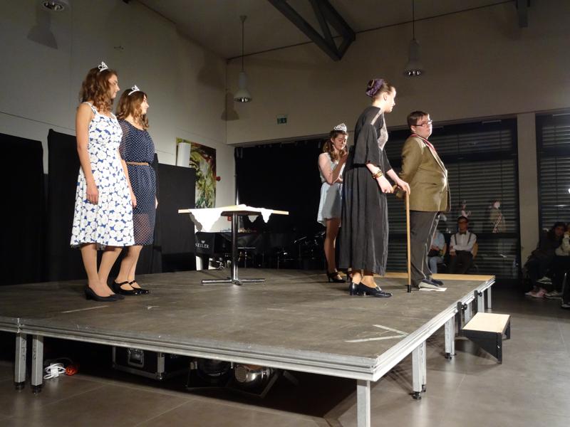 Vor allem jedoch sind schöne Typen dabei, der leicht zerstreute Professor Saputo etwa (prima: Nico Strobel), eine herrische Propagandaministerin (eindrucksvoll dominant: Esther Lang) und eine angenehm grantige Königinmutter (Ann-Kathrin Schulz). Allen voran als König Pippo XI. legt Christopher Jungk eine routinierte Vorstellung hin. Prima sind auch die eingespielten TV-Werbespots, klugerweise sehr knapp und dadurch prägnant gelungen. Insgesamt ein kurzweiliger, humorvoller und von seiner expressiven Substanz her sehr ansehnlicher Schultheaterabend. Riesenbeifall.