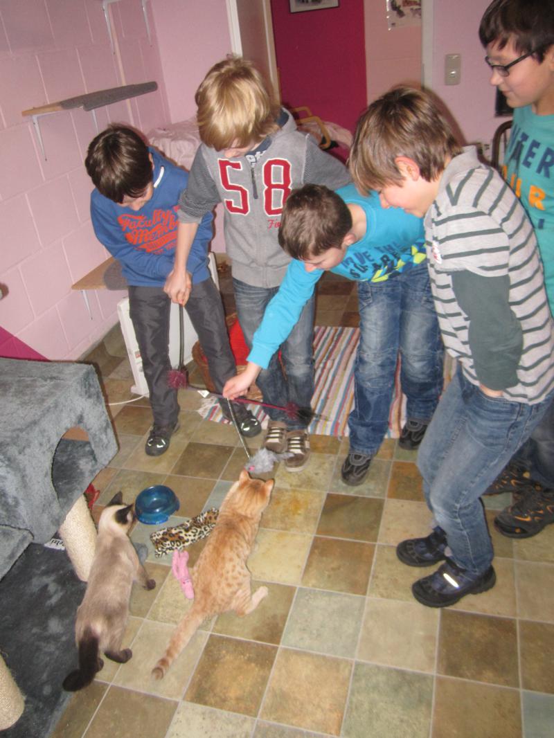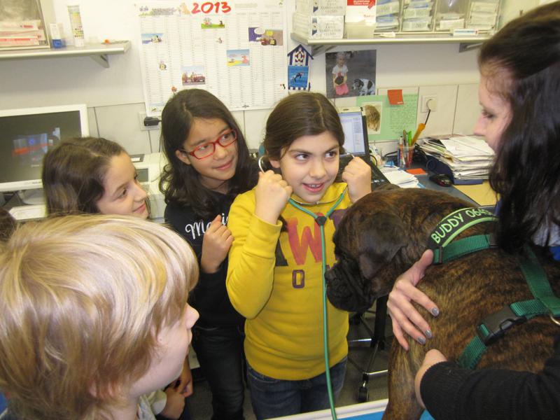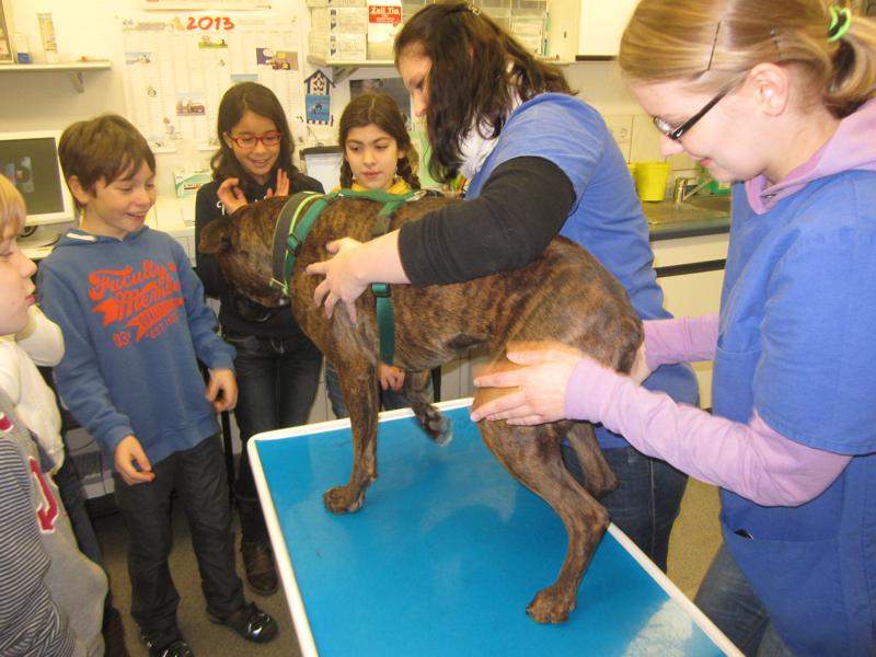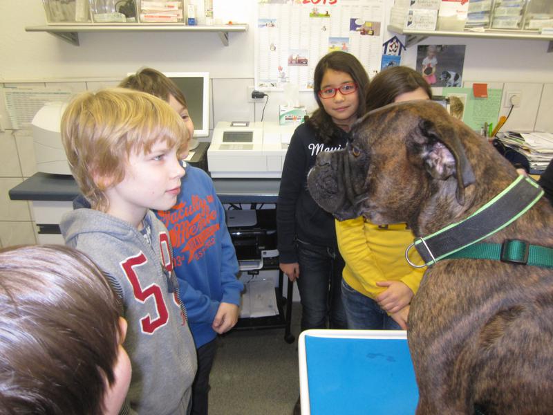 Kurz vor den Weihnachtsferien besuchten Schülerinnen und Schüler der Science-Klasse 5c mit Frau Beck und Frau Lehr die Kleintierpraxis von Frau Nicole Schmidt in Heuchelheim. Die Tierärztin erwies sich als geduldige Expertin zum „Löcher in den Bauch fragen“ über Haustiere, deren Verhalten und Krankheiten. Auch der artgerechte Umgang mit Tieren und die große Verantwortung als Haustierbesitzer wurden thematisiert. Insbesondere die 5 Monate alten Katzen in der Tieroase, in der Katzen aus Südeuropa in gute Hände vermittelt werden, stießen auf Begeisterung und der Schmuse- und Spieltrieb wurde auf beiden Seiten genossen. Nebenbei wurde viel über Katzen, deren Körperbau und besondere Sinne erfragt und erfahren. Zur Wiederholung der Säugetiermerkmale aus dem Science-Unterricht war auch Hund Buddy ein eindrucksvolles „Lebendobjekt“. Die SchülerInnen hörten dessen Herzgeräusche ab, bestaunten die Zähne des Boxers, analysierten verschiedene Röntgenbilder und erwiesen sich als neugierige „Junior Tierärzte“. Eindrücke dieses wunderbar haptischen Vormittags zeigen die Fotos.