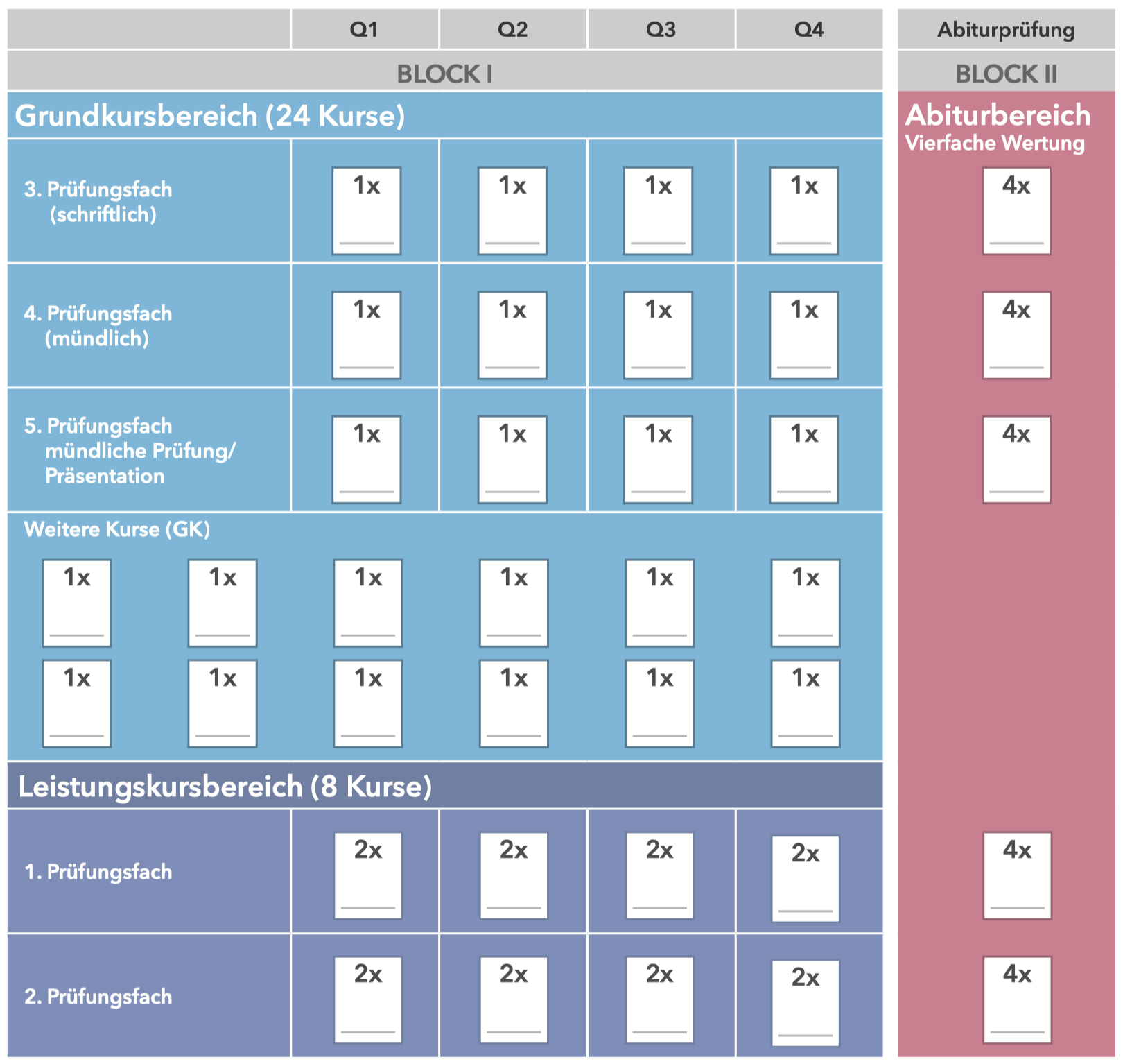 Die Gesamtqualifikation für das Abitur erreichnet sich aus den 8 eingebrachten Leistungskurshalbjahren, den 24 eingebrachten Grundkurshalbjahren und den 5 Abiturprüfungen.