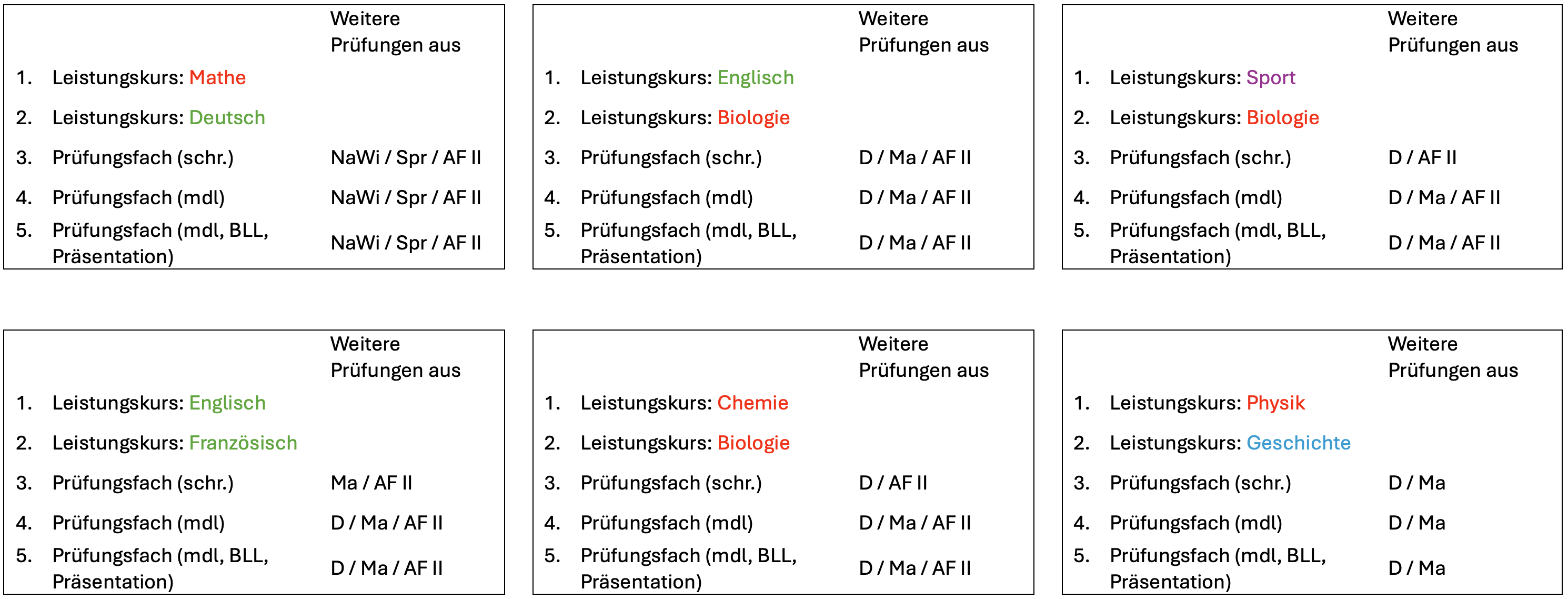 Kompliziert? Hier mal ein paar Beipiele für mögliche Kombinationen von Prüfungsfächern: