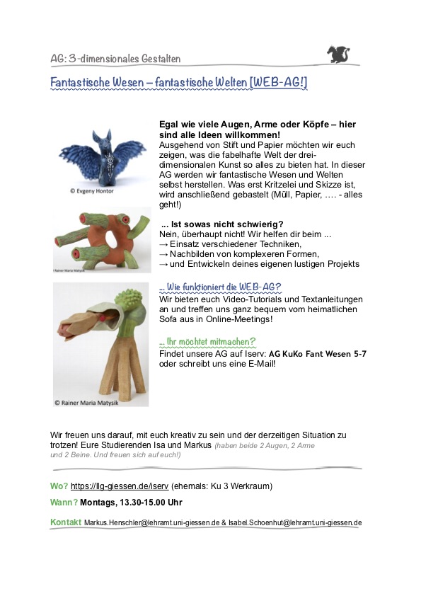 hier haben wir für euch kurze Infotexte zu unseren Kunstangeboten gepostet. Ihr könnt euch hier auch noch einmal mit euren Eltern gemeinsam über die Angebote informieren.