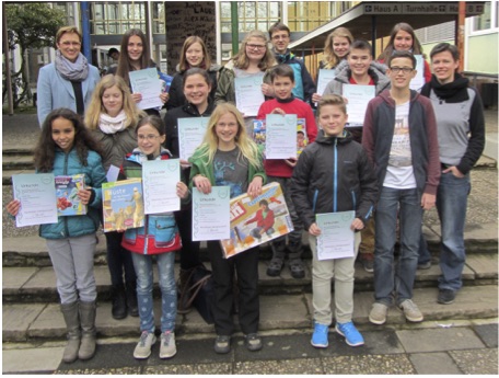 Bildnachweis(Privatfoto): Die Preisträger des Landgraf-Ludwigs-Gymnasiums zusammen mit Wettbewerbskoordinatorin Jerry Schneider-Möhl