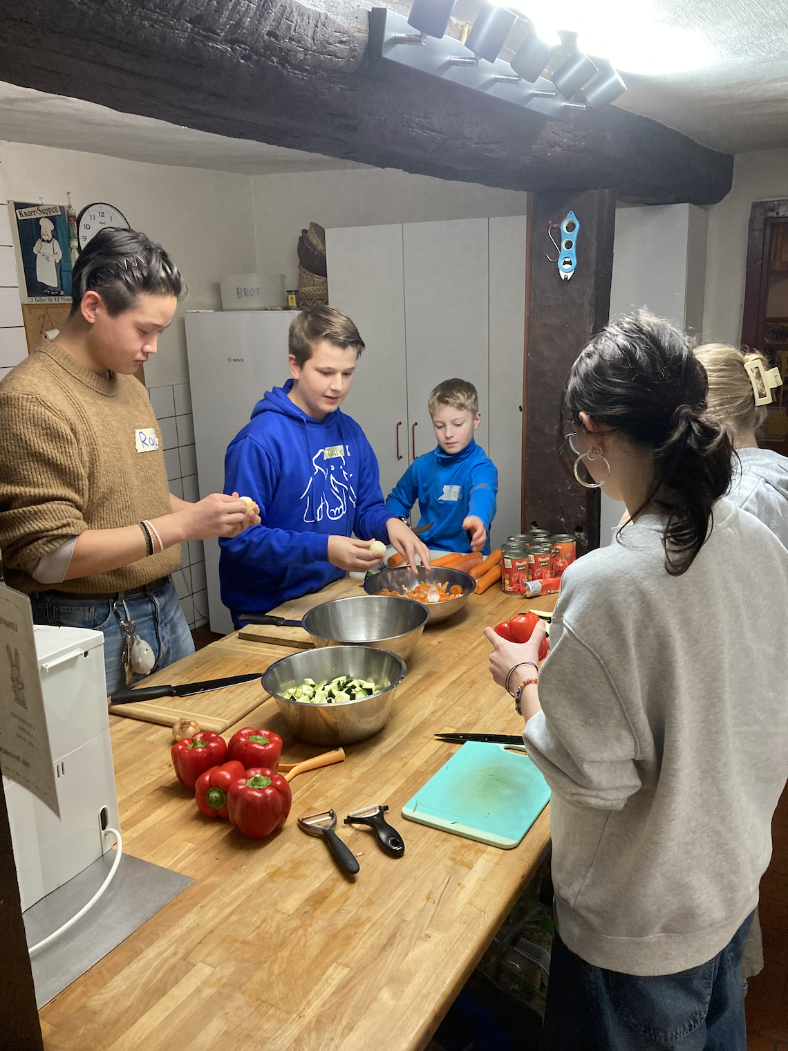 Nachdem freitagabends alle Schülerinnen und Schüler den Weg zur Steinesmühle gefunden und ihre Zimmer bezogen hatten, wurde gemeinsam geschnippelt, gekocht und gegessen. Das gemütliche Miteinander des ersten Abends wurde genutzt, um die Erwartungen, Wünsche und Ziele der Gruppe hinsichtlich des SV-Wochenendes zu sammeln und ihn letztlich mit unzähligen Runden Werwolf ausklingen zu lassen.