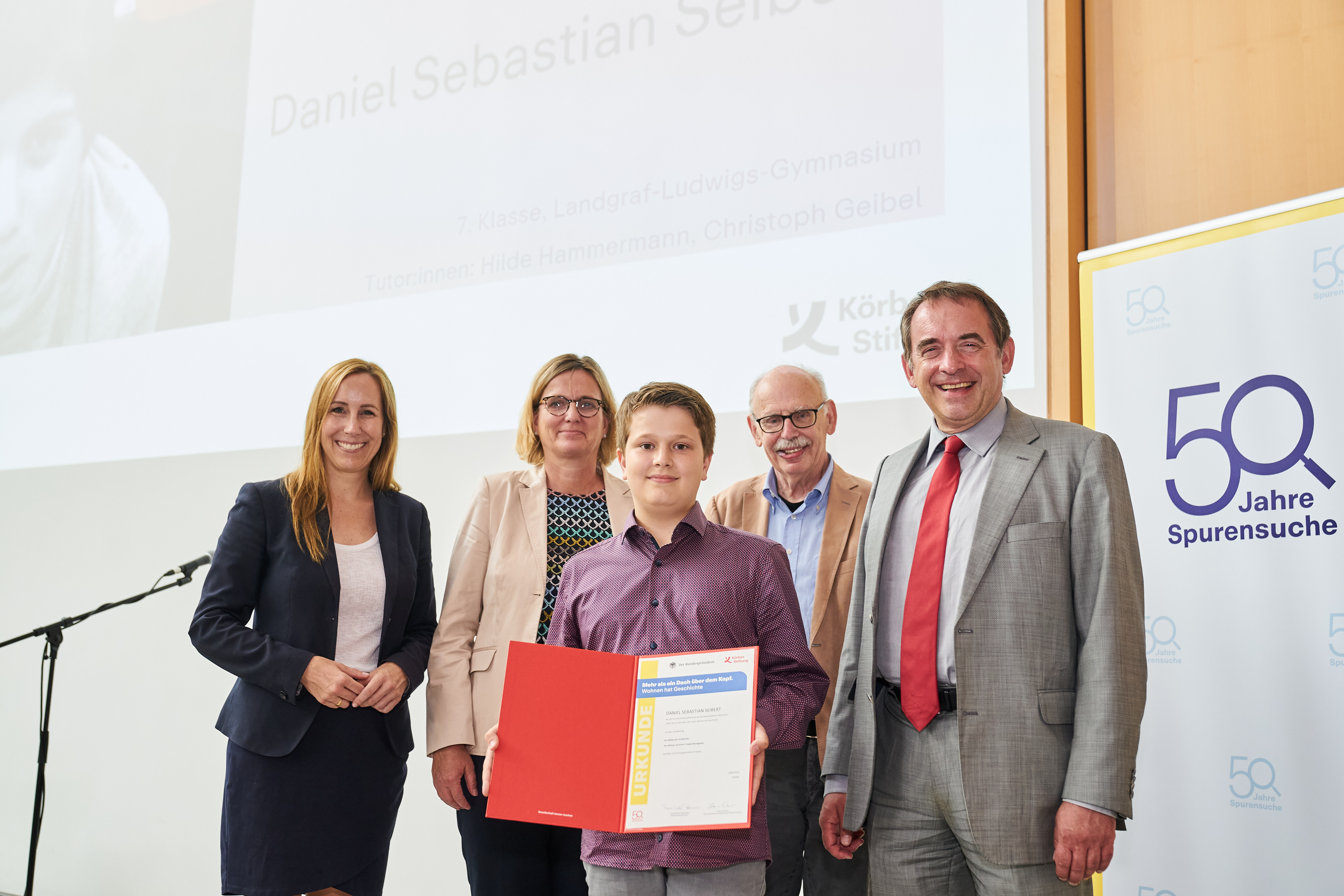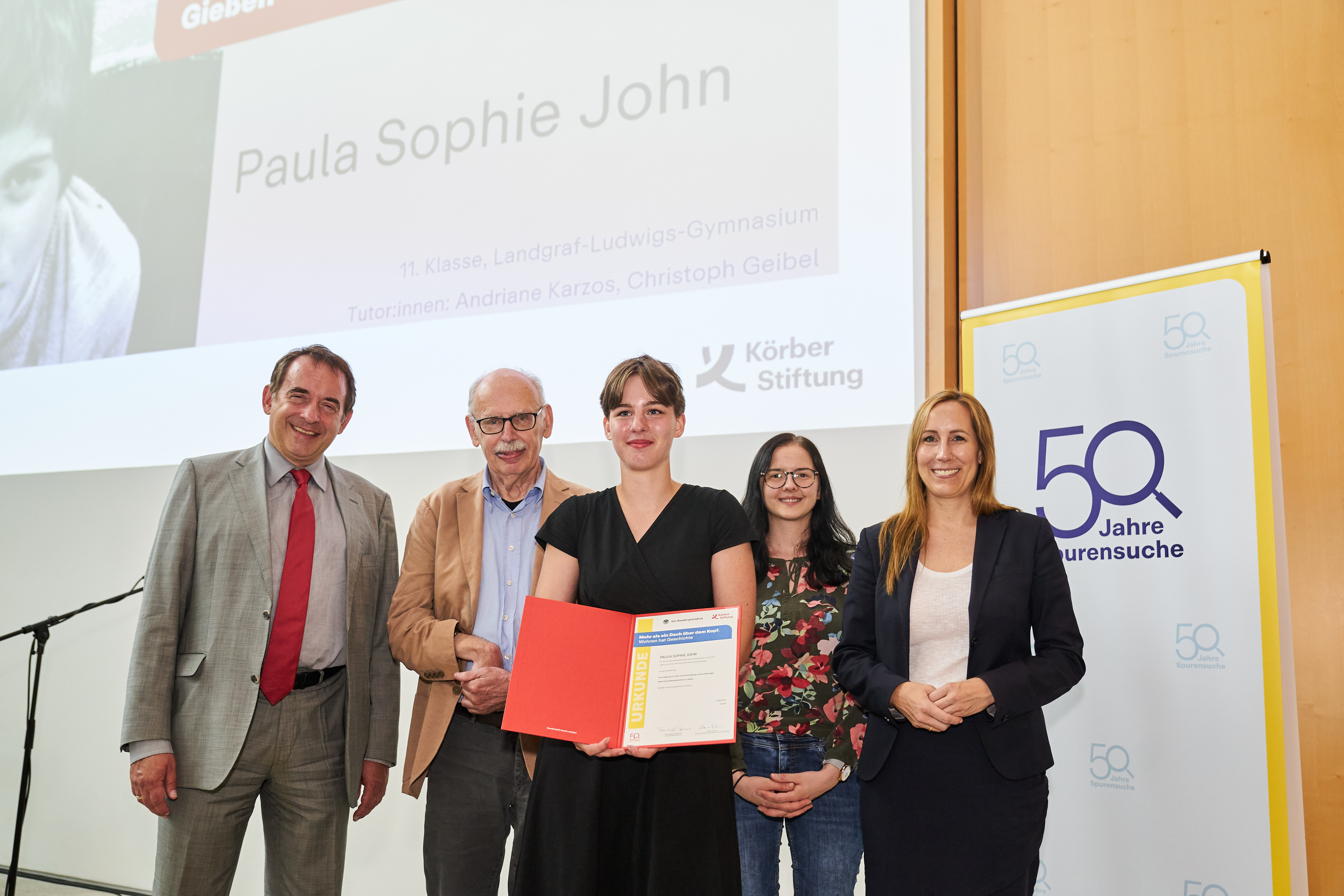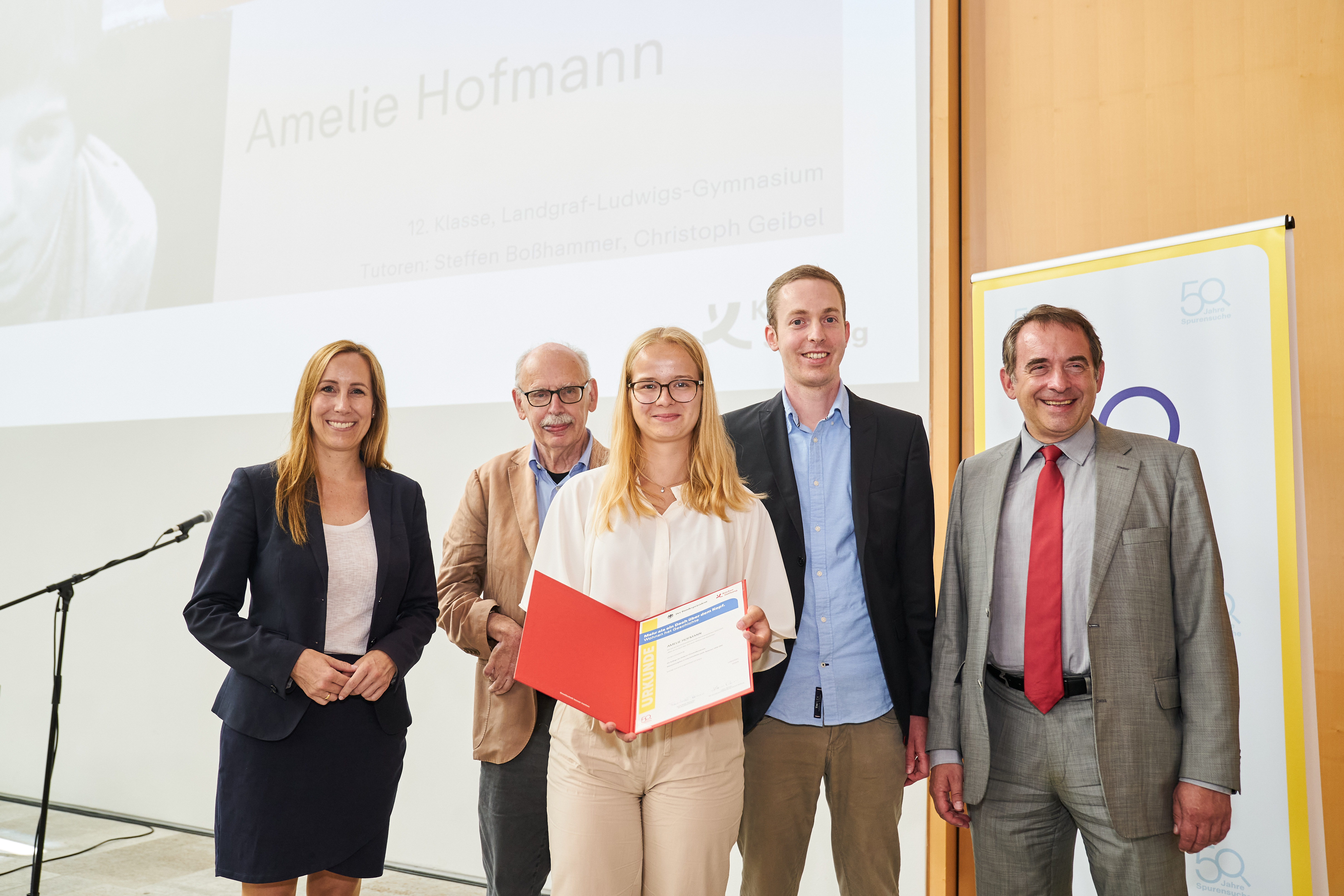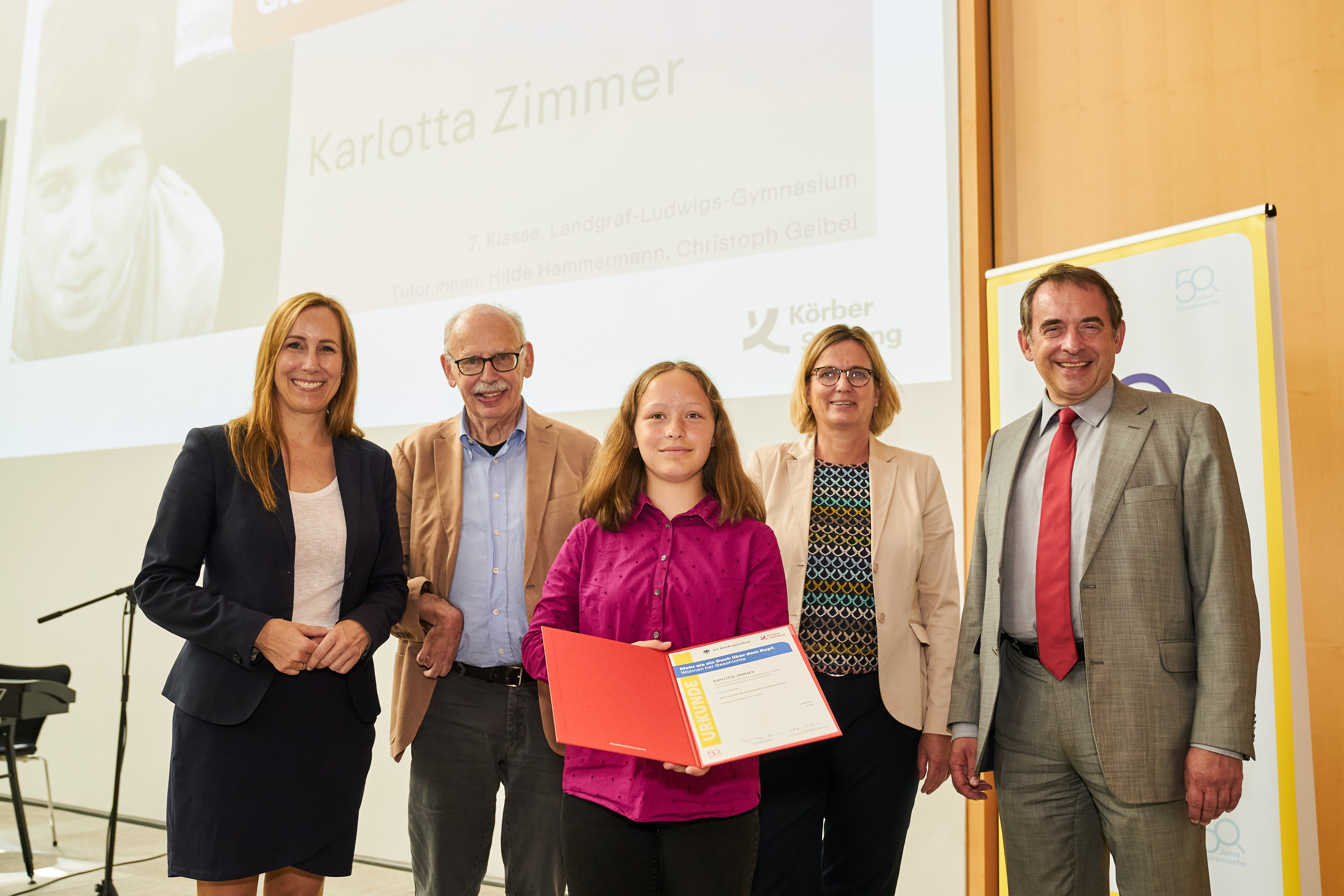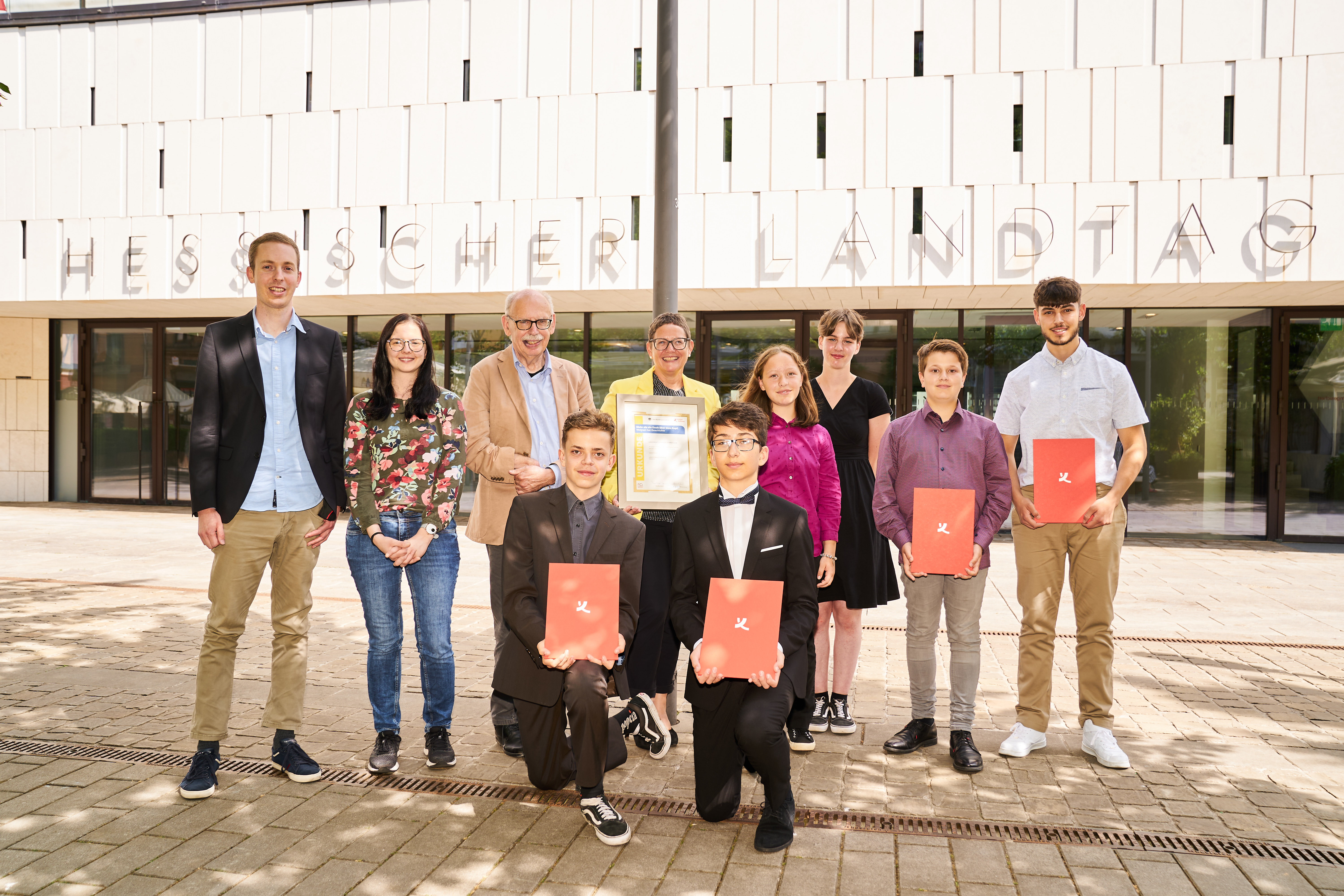 Am Montag, 10. Juli konnten die diesjährigen Landespreisträgerinnen und - träger des LLGs beim Geschichtswettbewerb des Bundespräsidenten von Kultusminister Prof. Alexander Lorz und Landtagspräsidentin Astrid Wallmann ihre Urkunden im Hessischen Landtag in Empfang nehmen. Zusammen mit den Tutorinnen und Tutoren war auch Schulleiterin Annette Pfannmüller mit nach Wiesbaden gereist, um die Auszeichnung "landesbeste Schule" entgegen zu nehmen.