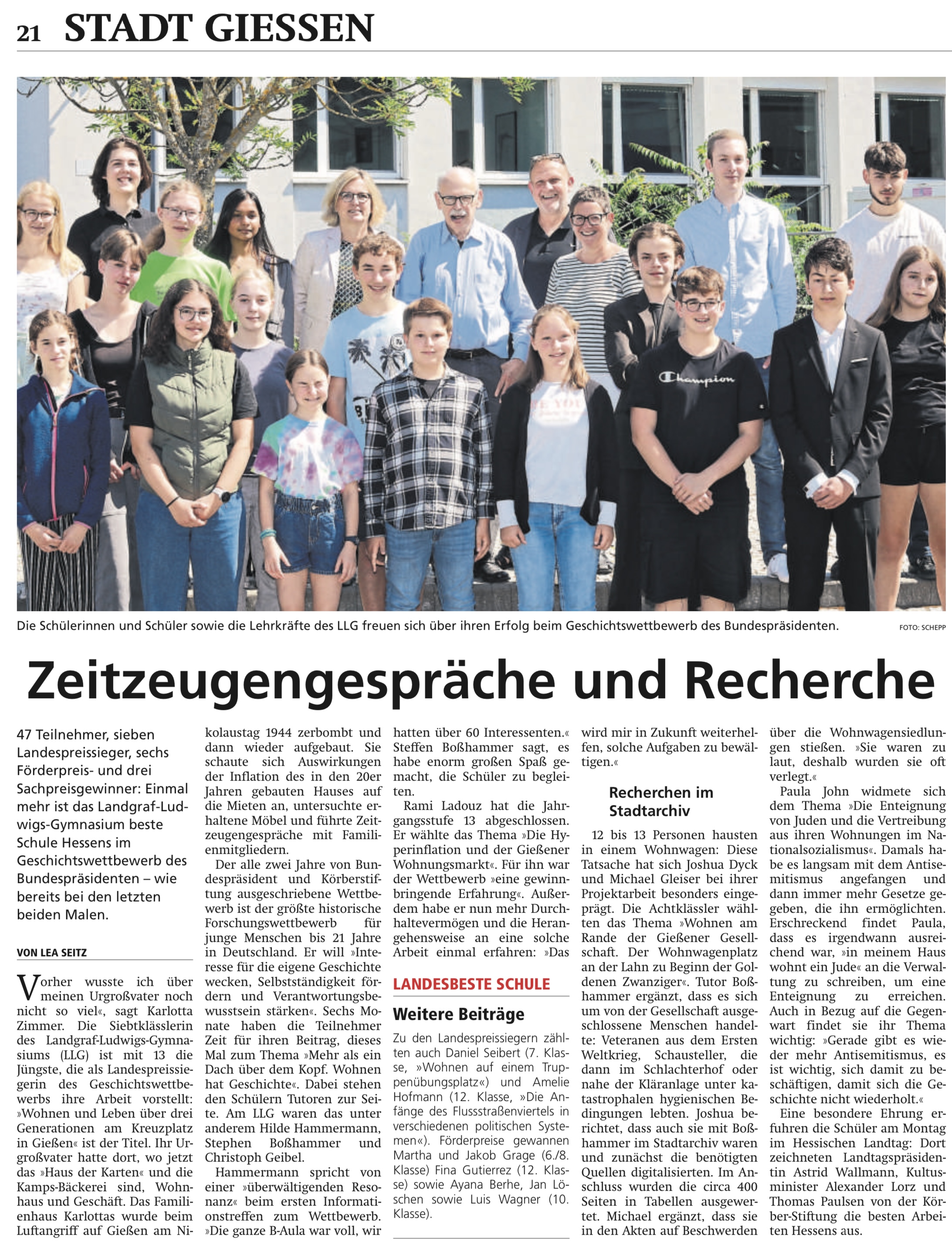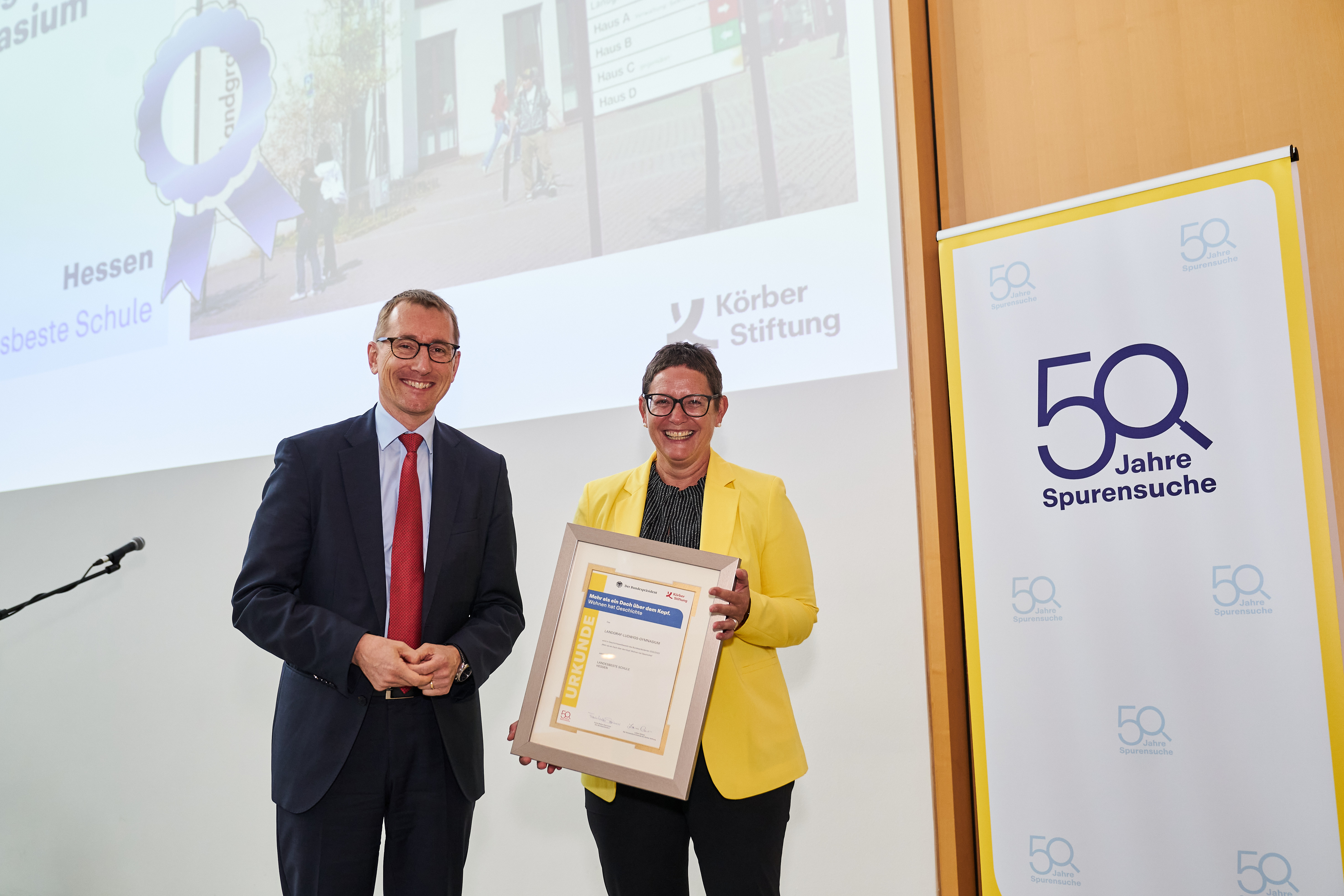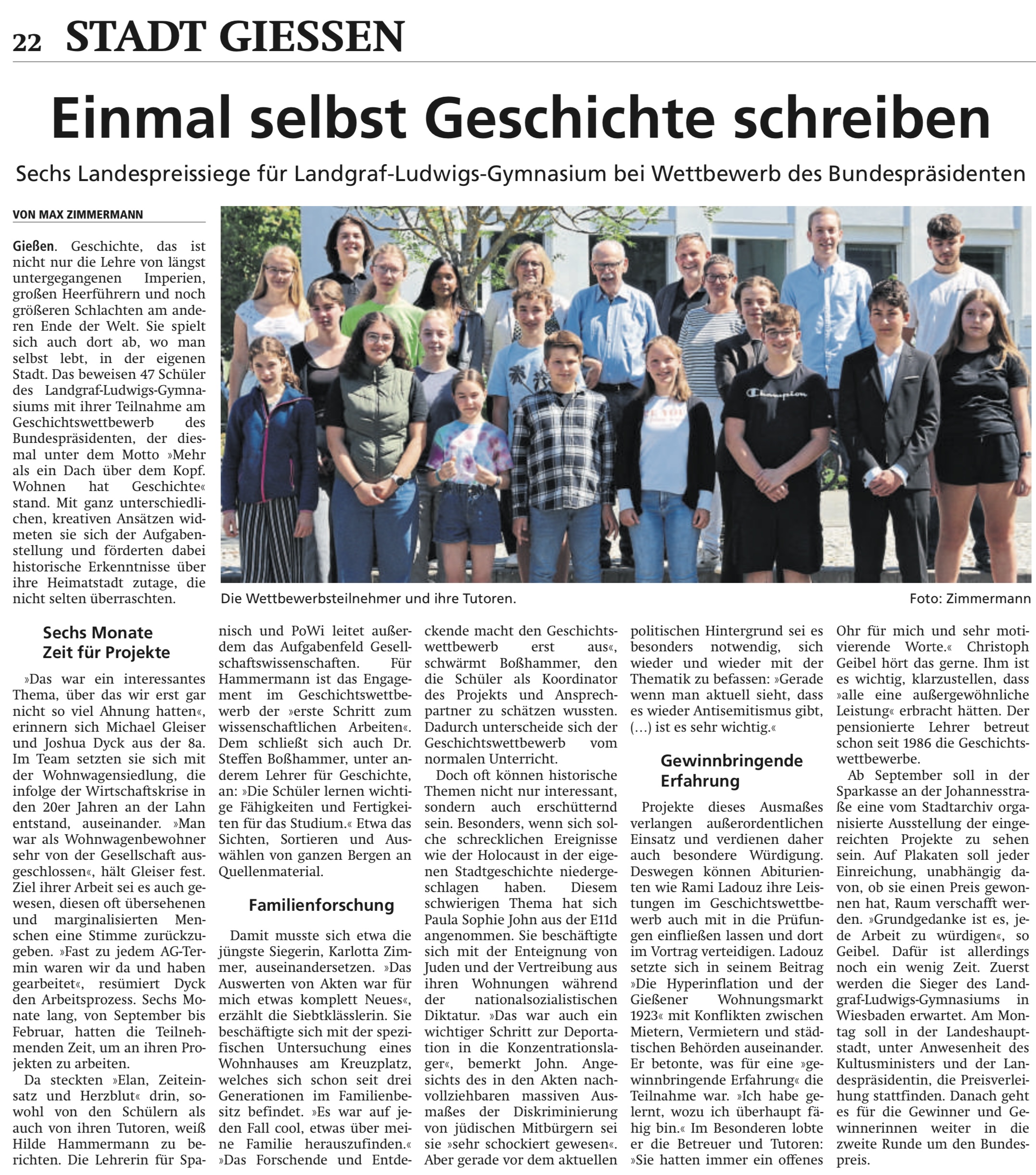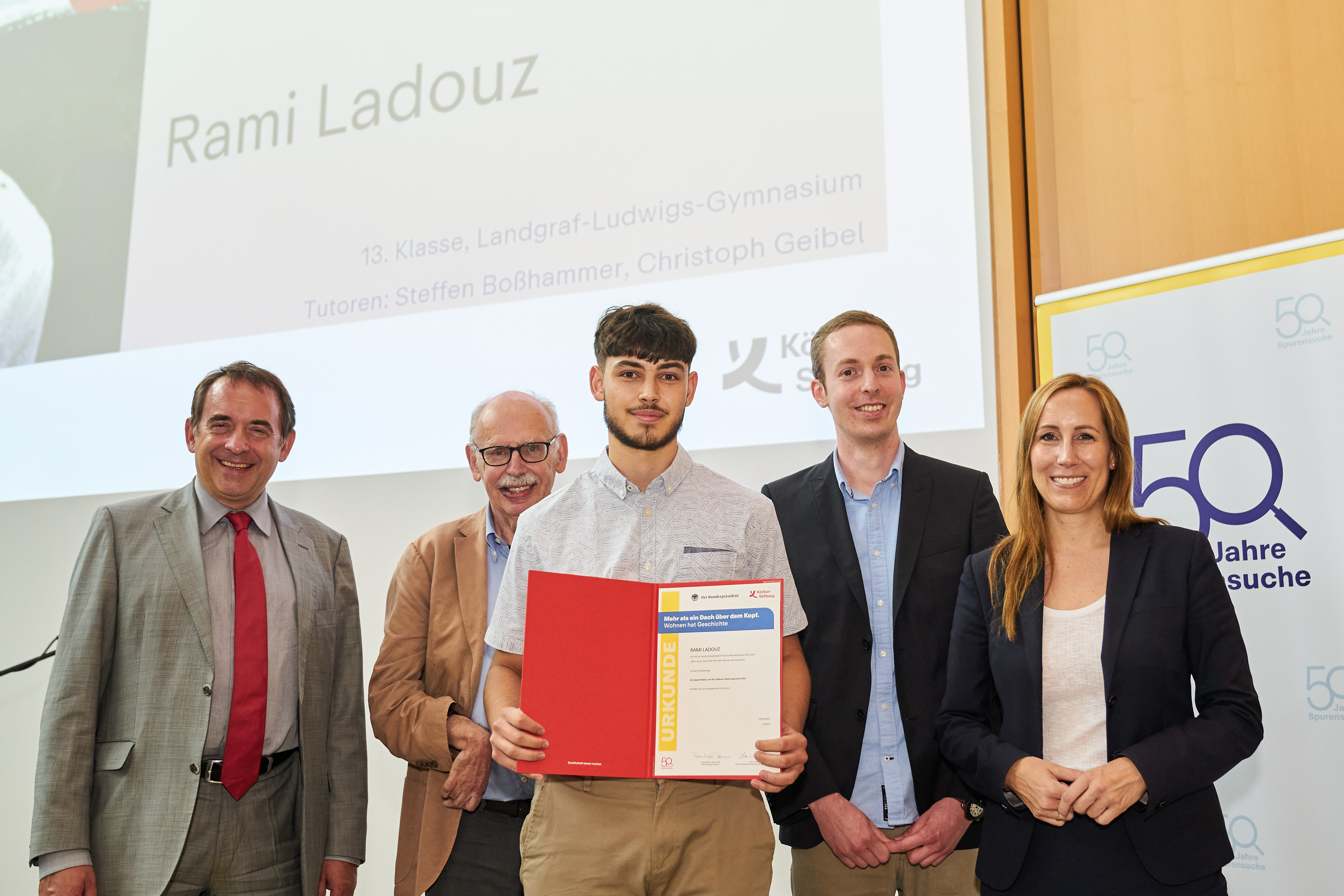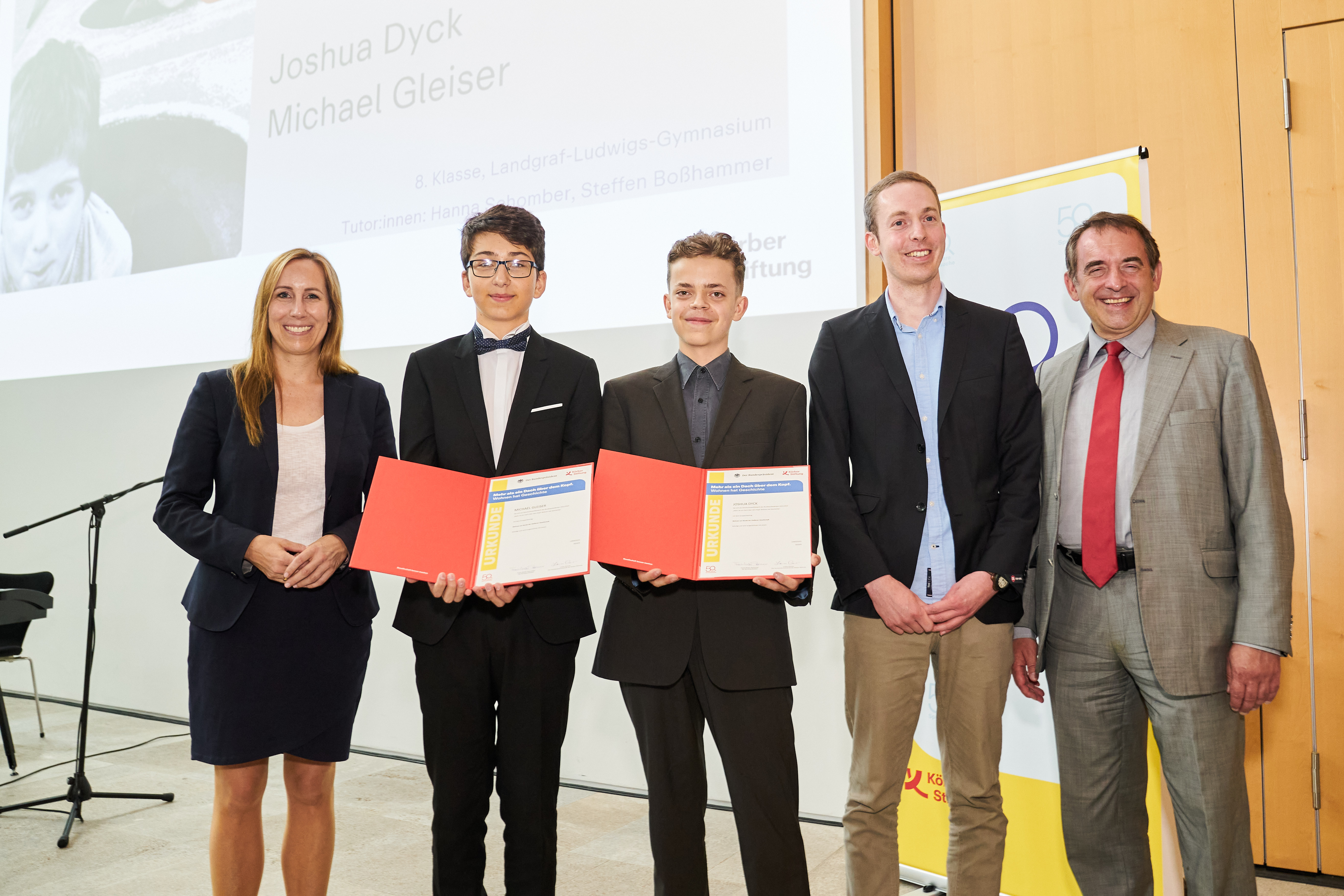 Am Montag, 10. Juli konnten die diesjährigen Landespreisträgerinnen und - träger des LLGs beim Geschichtswettbewerb des Bundespräsidenten von Kultusminister Prof. Alexander Lorz und Landtagspräsidentin Astrid Wallmann ihre Urkunden im Hessischen Landtag in Empfang nehmen. Zusammen mit den Tutorinnen und Tutoren war auch Schulleiterin Annette Pfannmüller mit nach Wiesbaden gereist, um die Auszeichnung "landesbeste Schule" entgegen zu nehmen.