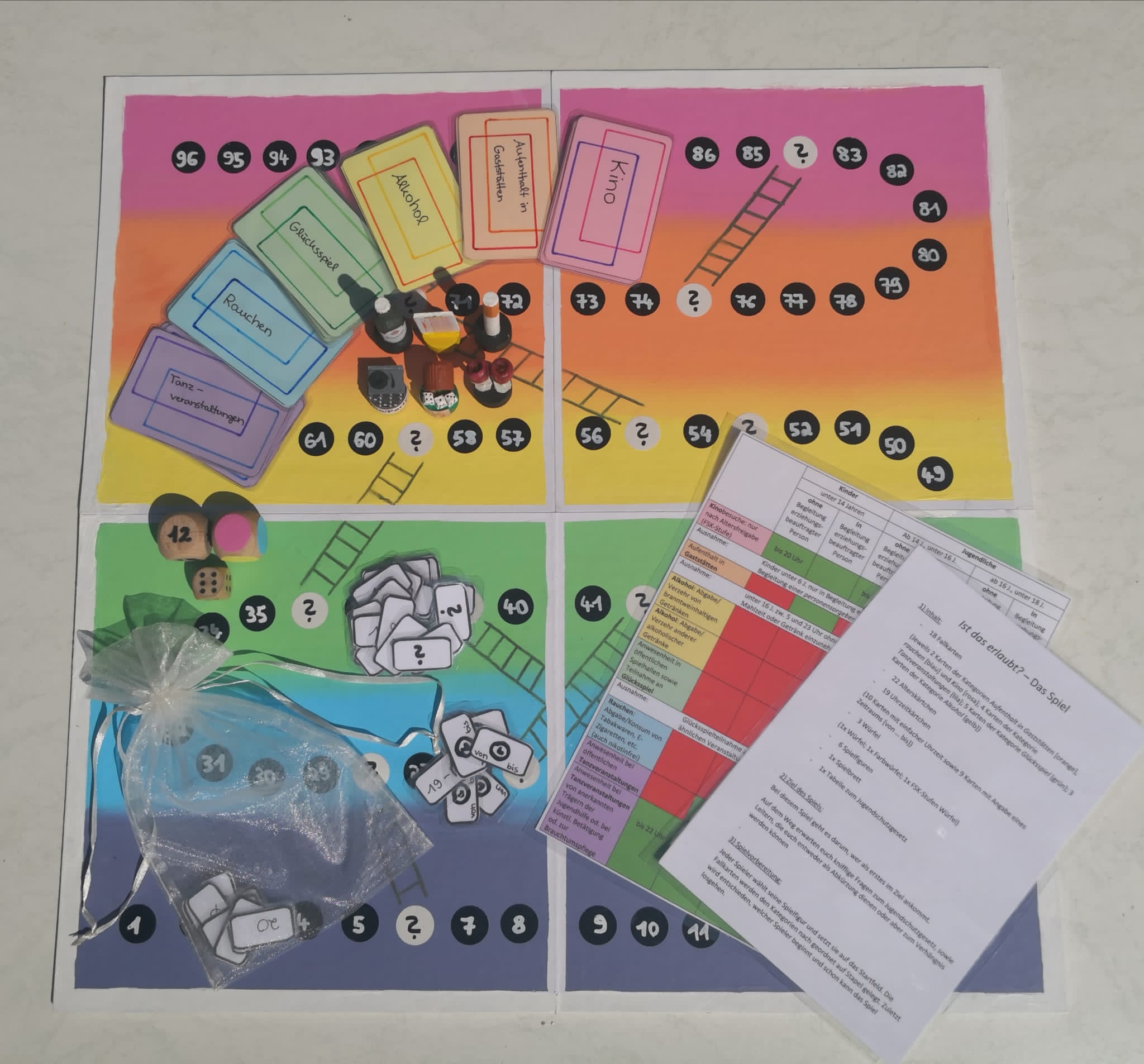 Spielbrett, Spielidee, Anleitung, Karten, alles haben die beiden Schülerinnen selbst entwickelt und gestaltet. Entstanden ist ein interessantes und spannendes Spiel zum Thema „Jugendschutzgesetz“ und man kann davon ausgehen, dass sich die beiden Spielentwicklerinnen, Jette und Caitlyn, in diesem Gesetz jetzt richtig gut auskennen.