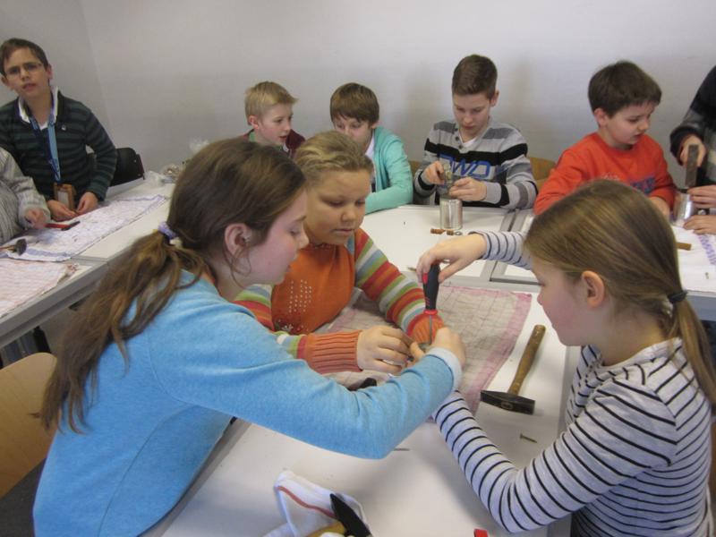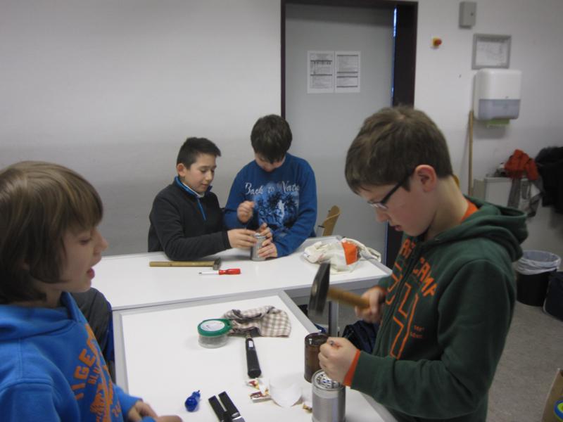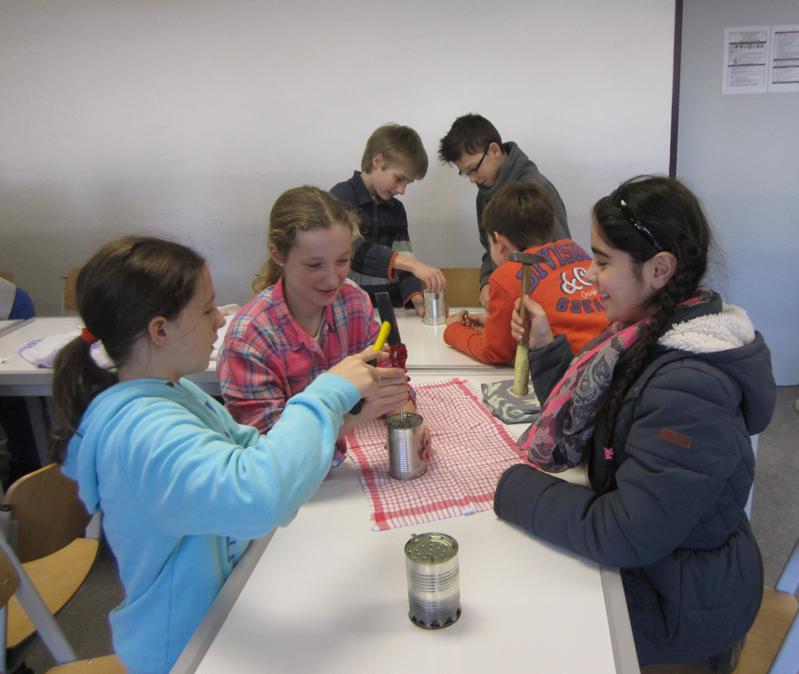 Auf dem Niveau von „Nawi-Kids“ wurde deutlich, dass die Pyrolyse-Öfen ökologisch viele Vorteile bieten, aber auch die afrikanischen Familien, die diese Pyrolyse-Öfen in Hütten einsetzen, in ihrem Alltag stark unterstützen. Aus dem Alltag bzw. dem Müll der Schülerinnen und Schüler stammten dann auch die für denn Pyrolyse-Ofen benötigten Materialien: Metalldosen für den Brenner und Nussschalen als Brennmaterial. Bevor es zum heiß ersehnten Feuermachen kam, musste handwerkliches Geschick bewiesen werden: Hämmern, Bohren, Schrauben eindrehen. Höhepunkt war der praktische Einsatz der Öfen! Teile des Schulhofes wurden ordentlich in Rauch gehüllt. Beeindruckend waren auch olfaktorischen Begleiterscheinungen, insbesondere in der in der Kleidung.